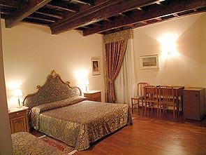 Camere lussuose dai soffitti in legno, parquet e giochi di specchi.